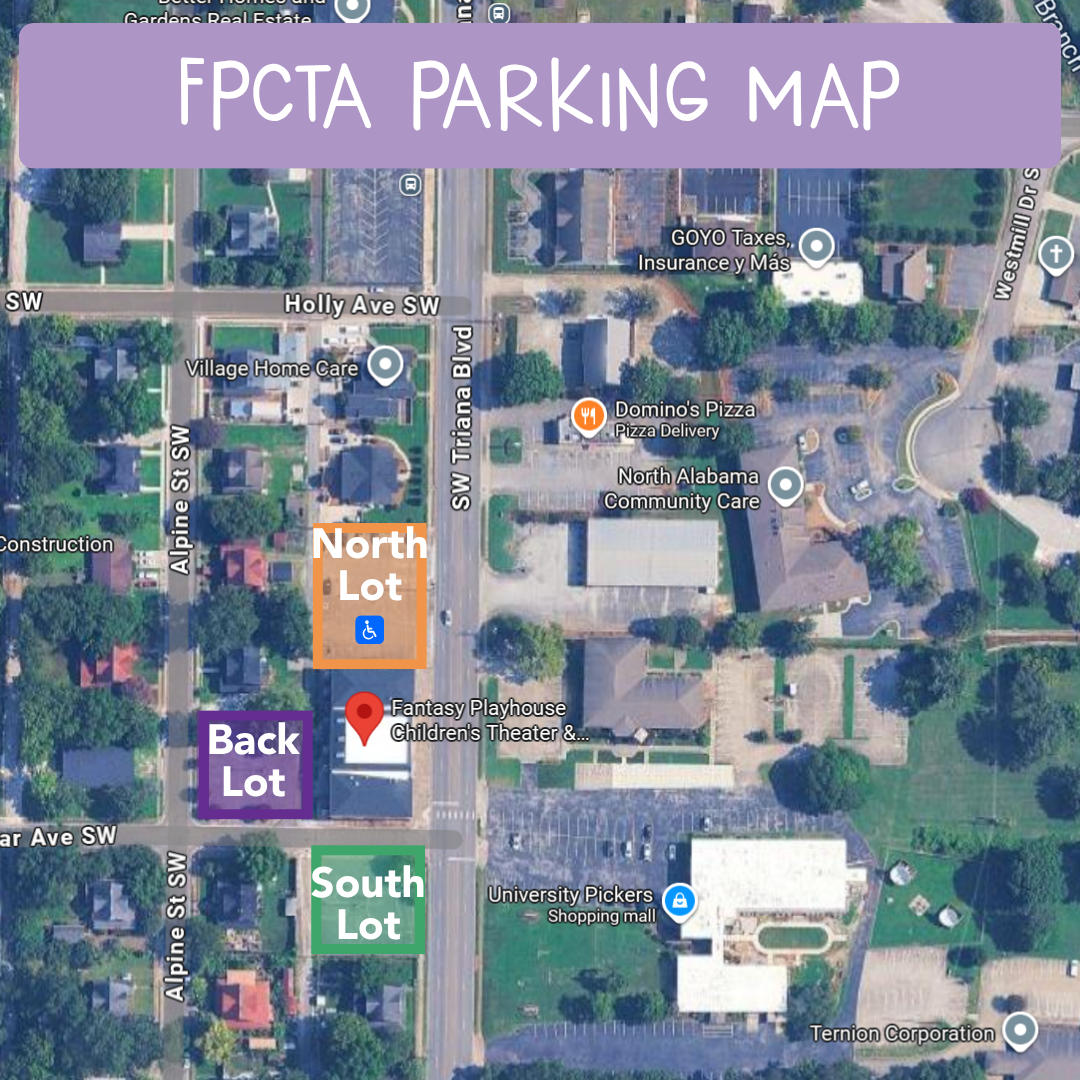 We are thrilled to share that parking on the Boulevard is completely FREE! We have three available lots for our patrons to utilize during public performances: North, South, and Back Lot (See image for reference)
